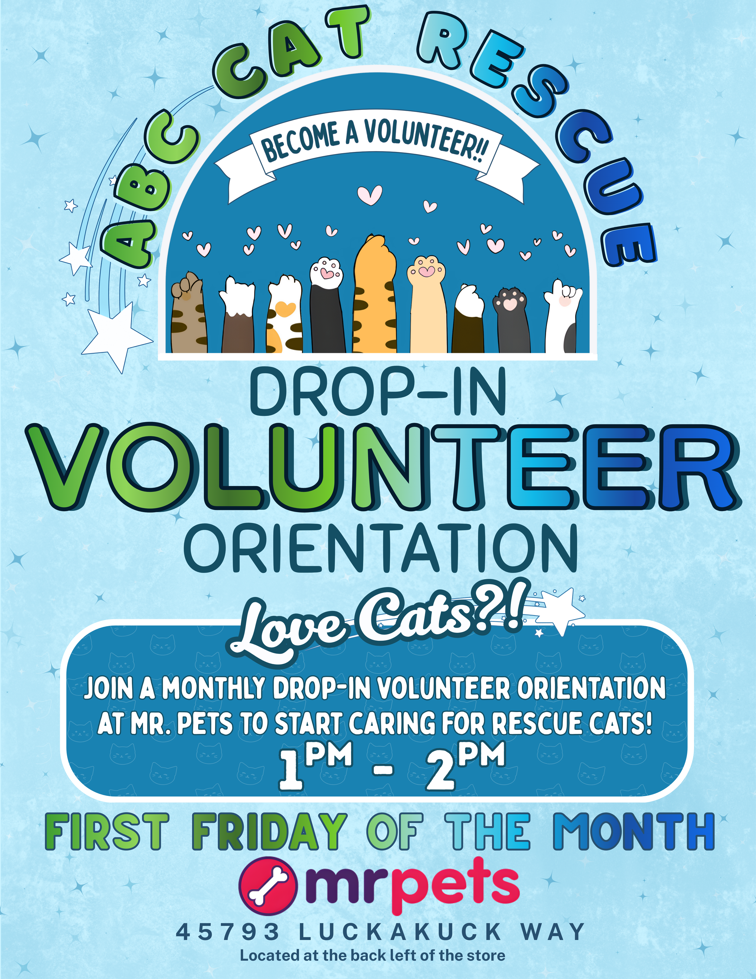 We need fantastic and patient volunteers for our space at Mr. Pet’s.